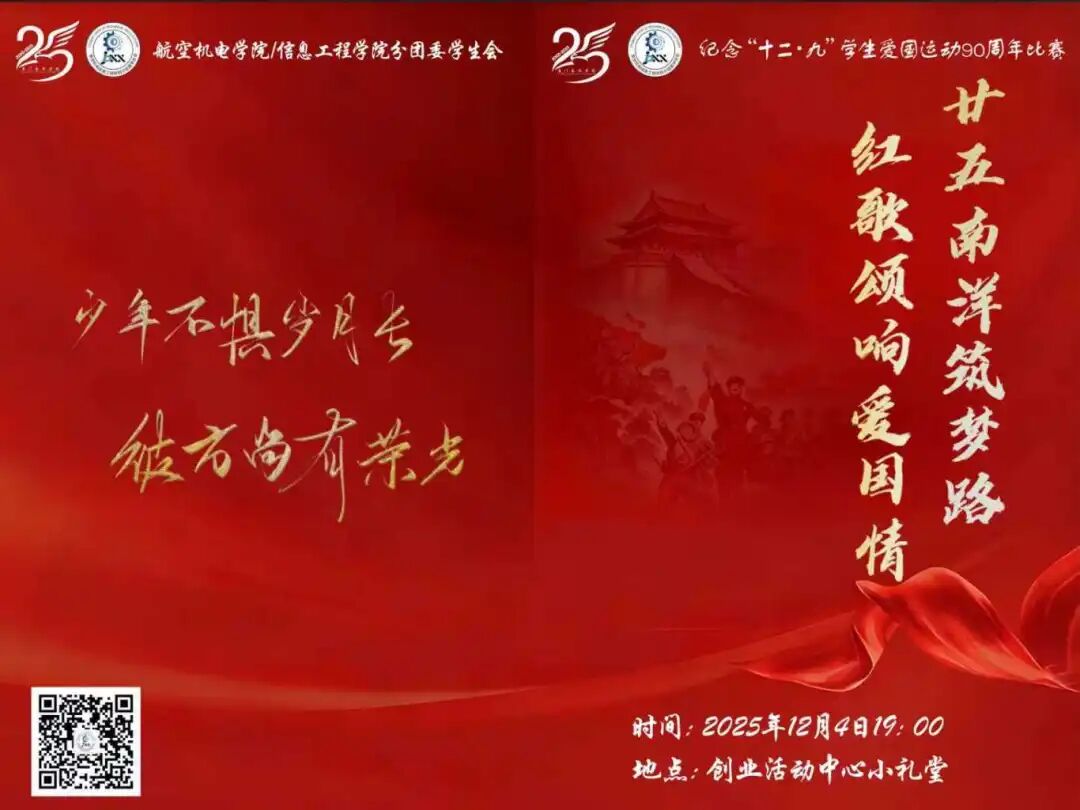 2025年12月4日19:00,航空机电学院/信息工程学院在创业活动中心小礼堂举办的 “廿五南洋筑梦路,红歌颂响爱国情”红歌赛。旋律里藏着青春理想,歌声中饱含爱国热忱,一曲曲经典曲目轮番上演,既有激昂奋进的力量,又有婉转深情的韵味,为现场观众带来沉浸式视听享受,让红色激情随音符涌动,让青春精彩在舞台绽放!