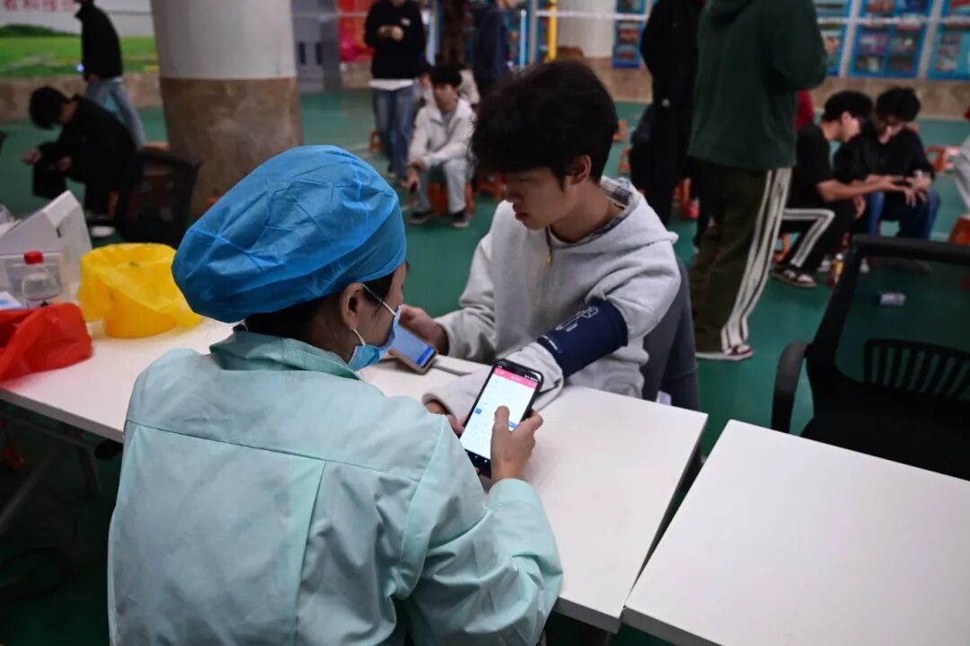 活动现场秩序井然,不少同学提前到场等候,带着参与公益的心意有序排队。在志愿者的引导下,大家依次填写个人基本信息表和健康征询表,遇到不清楚的地方,志愿者会当场解答疑问、指导填写规范。完成表格后,同学们前往体检区,逐一进行血压测量、血液质量筛查等基础检查。